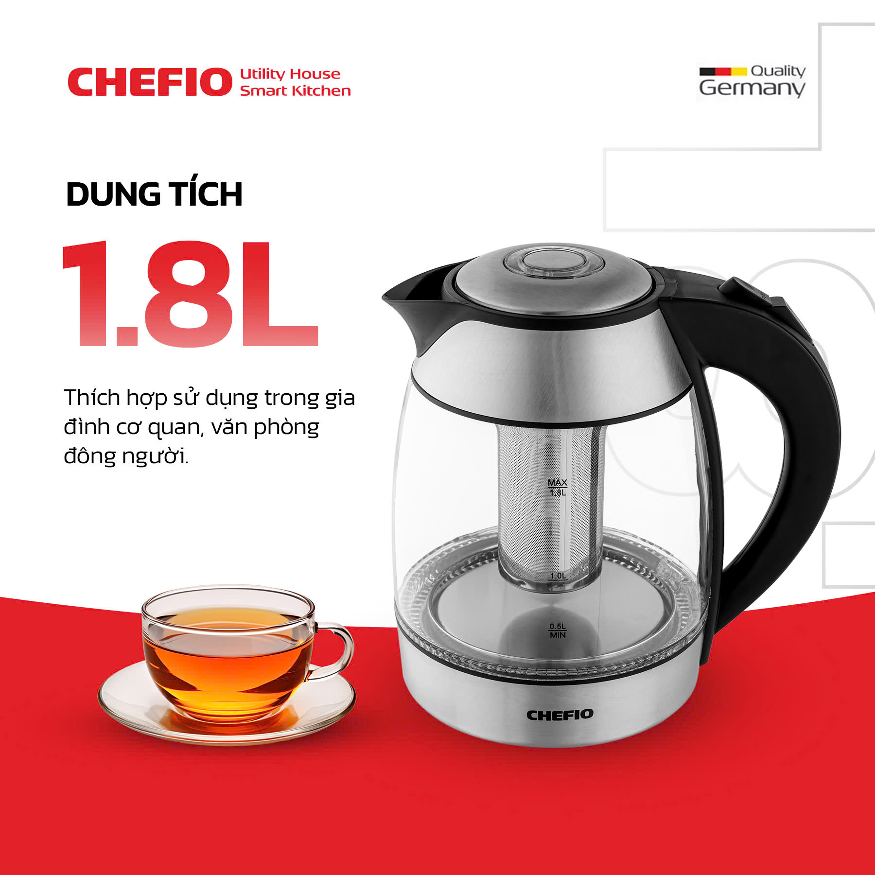 CHEFIO CFK2228 được chế tác từ thủy tinh cao cấp, trong suốt và có khả năng chịu nhiệt vượt trội. Không chỉ giúp người dùng dễ dàng quan sát quá trình đun nước, chất liệu này còn đảm bảo không thôi nhiễm hóa chất, an toàn tuyệt đối cho sức khỏe. Sự kết hợp giữa thiết kế tối giản và đường nét thanh thoát khiến sản phẩm trở thành điểm nhấn thanh lịch cho bất kỳ không gian bếp nào.